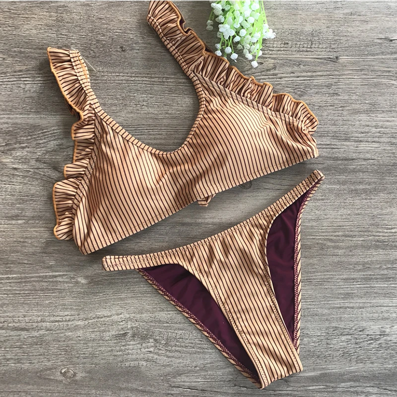 Полосатые бикини 2018 для женщин купальник сексуальный плечо рюшами Бикини Push Up Купальник рюшами ванный комплект летняя пляжная одежда женск...