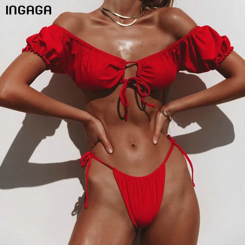 INGAGA бикини с открытыми плечами, сексуальный полый купальник, женский купальник с высокой посадкой, купальник для женщин, Красная Нить, купал...