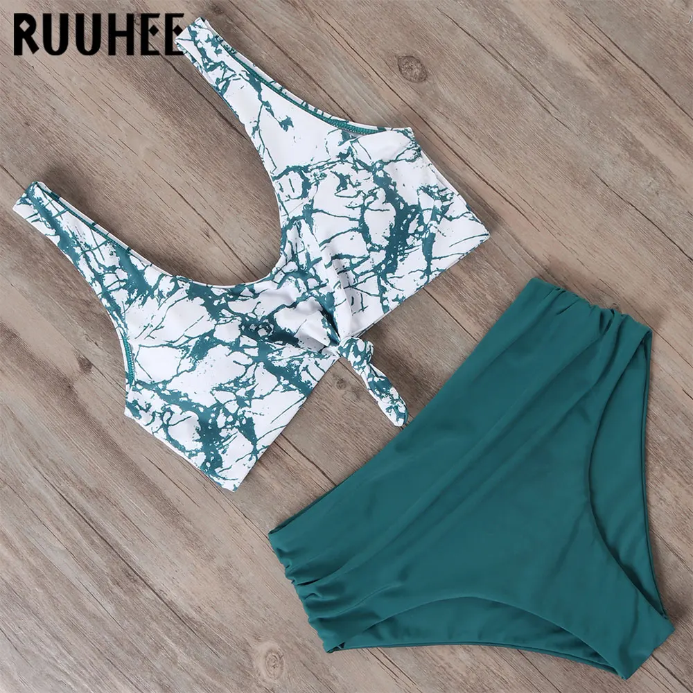 RUUHEE 2019 купальник с принтом женский купальник с узлом бикини комплект купальный костюм Высокая талия бикини колодки пляжная одежда Biquinis