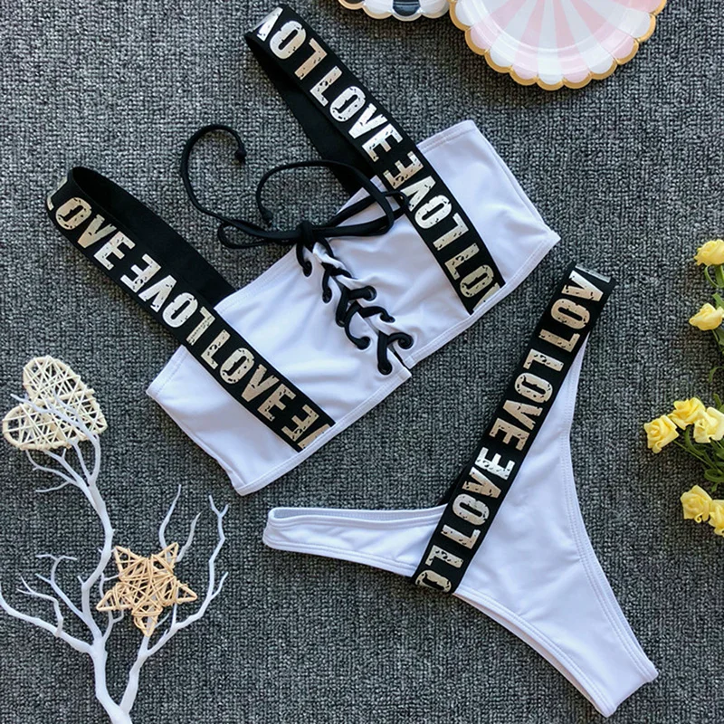Сексуальный Топик с буквенным принтом бикини комплект без бретелек Плавание костюм 2018 Плавание одежда Для Женщин Бразильские Бикини женск...
