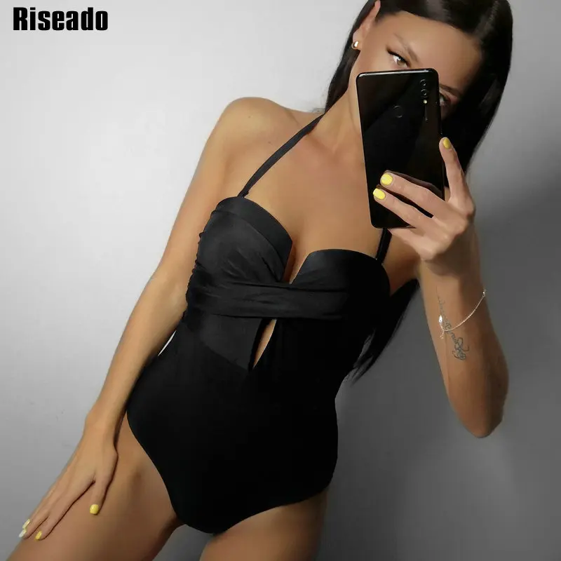 Riseado Новый Push Up одна деталь купальник сплошной 2019 купальники для малышек для женщин ремень купальники с завязкой на шее Ruched купальный костюм...