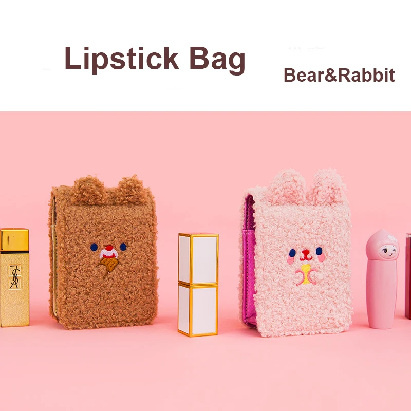Женская косметичка с зеркалом для макияжа, косметичка для девочек, чехол с милыми губными помадами, чехол с вышитым медведем и кроликом, плюшевые сумки