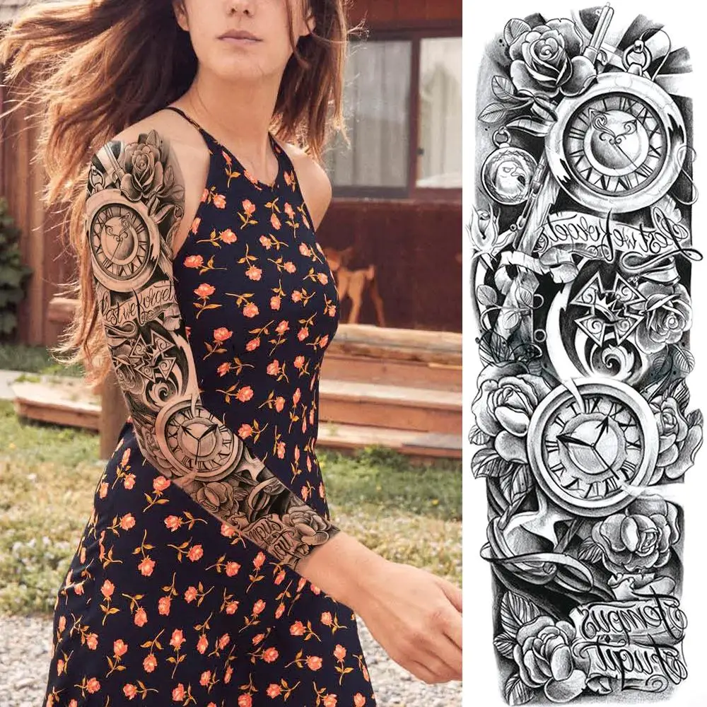 Черные Поддельные Временные татуировки на всю руку для женщин мужчин эскиз розы тату часы стикер водонепроницаемый реалистичный 3D глаза та...