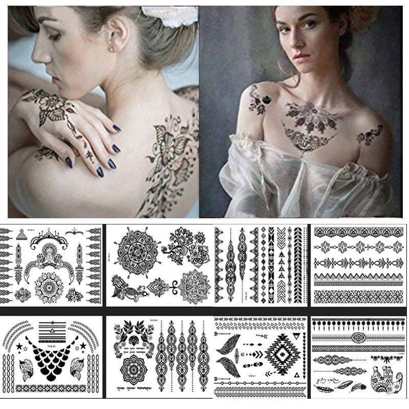 30 дизайнов, черная хна, татуировка на руку, наклейка, временная, водонепроницаемая, кружевная, боди-арт, Большая татуировка, поддельные татуировки, менди, стикеры татуировки под заказ