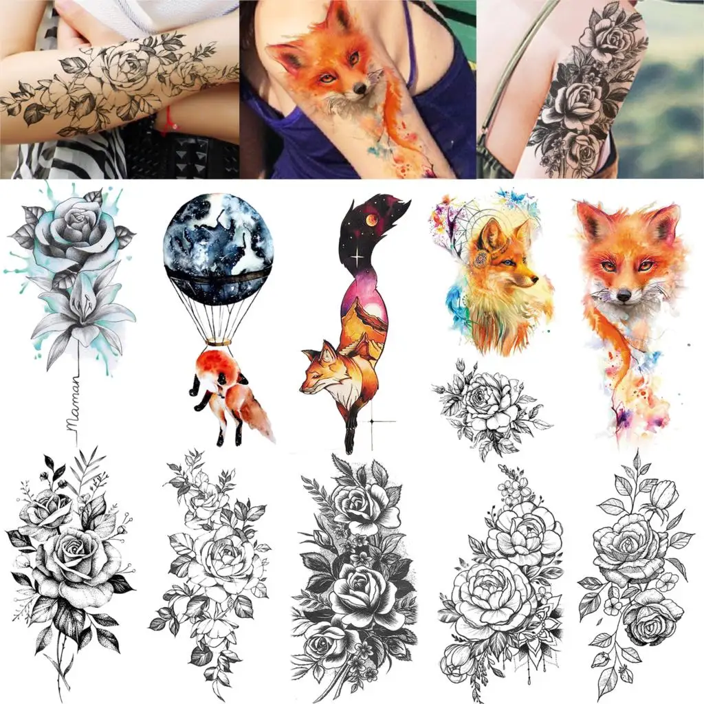 Акварельные цветные Временные татуировки лисы, наклейки, пионы, цветы, тату, 3D креативные боди-арт, водонепроницаемые женские модные татуир...