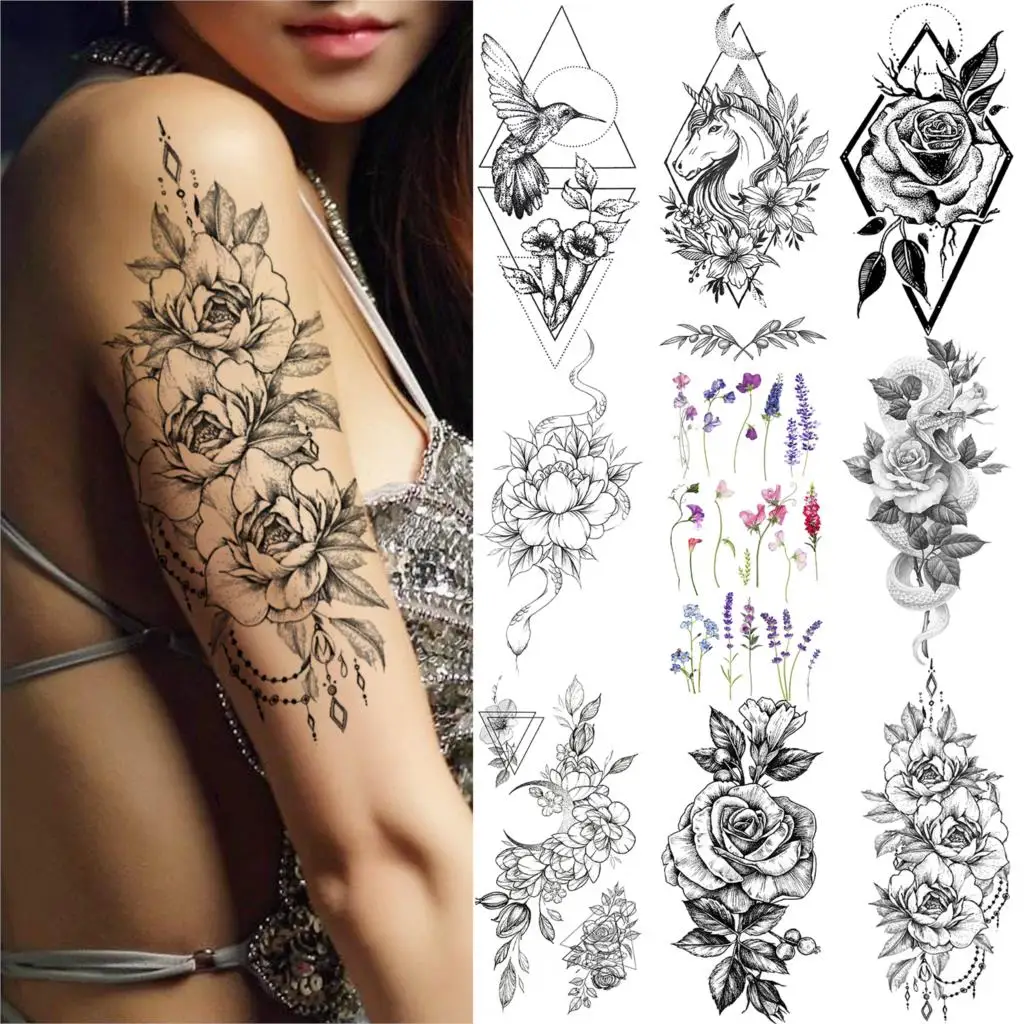 Геометрические ФЭК розы временные татуировки наклейки для Женщин Единорог цветок татуировки сексуальный цветок Водонепроницаемый Змея та...
