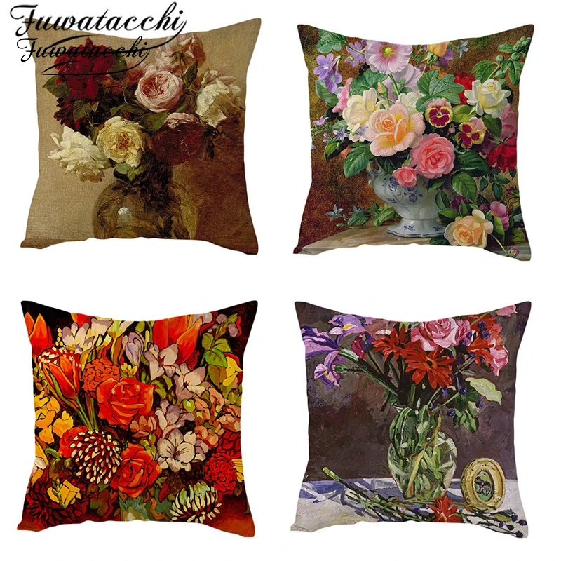Чехол на подушку из чистого льна Fuwatacchi, наволочка с розами для домашнего стула, дивана, декоративные подушки, масляные подушки с цветами