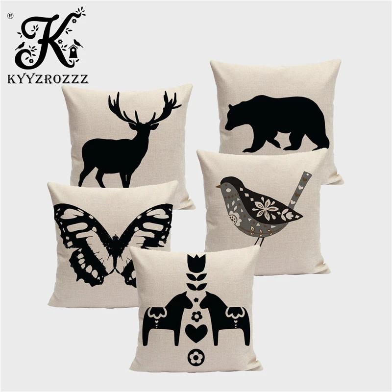 Высокое качество черно-белый печатный чехол для подушки с изображением животных маленькая птица медведь Лось бабочка дерево украшение дом...
