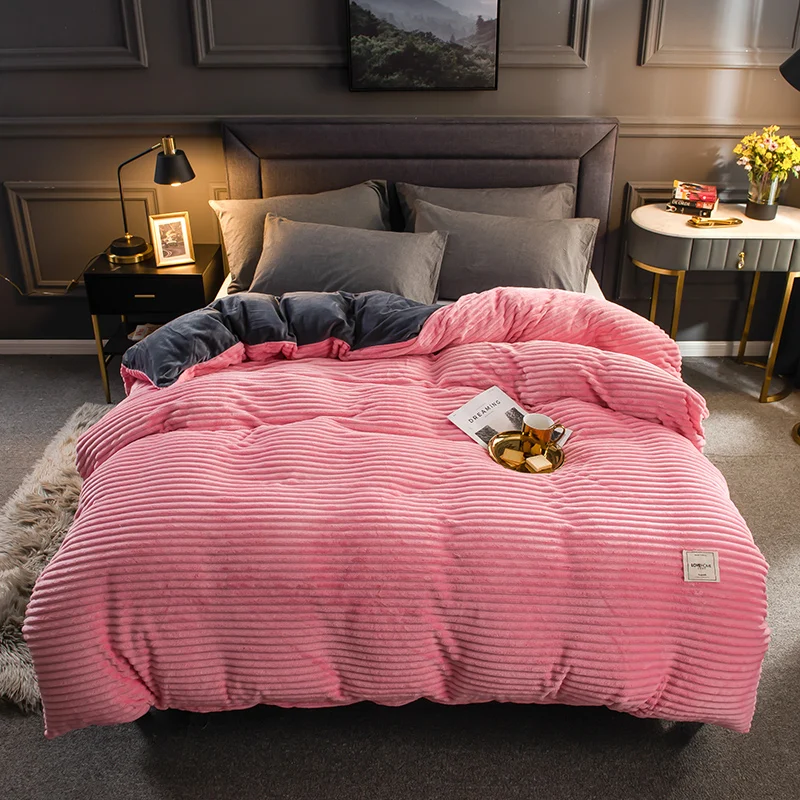 Комплект постельного белья из плотного бархата кораллового цвета в полоску, зимний теплый фланелевый пододеяльник, простыня, наволочки, од...