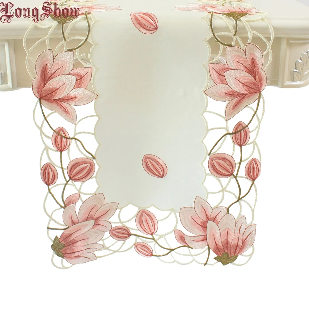 Бесплатная доставка Новые Роскошные Дизайнерские розовый желтый Цвет цветочный ручной атласной вышивкой ришелье Настольная дорожка