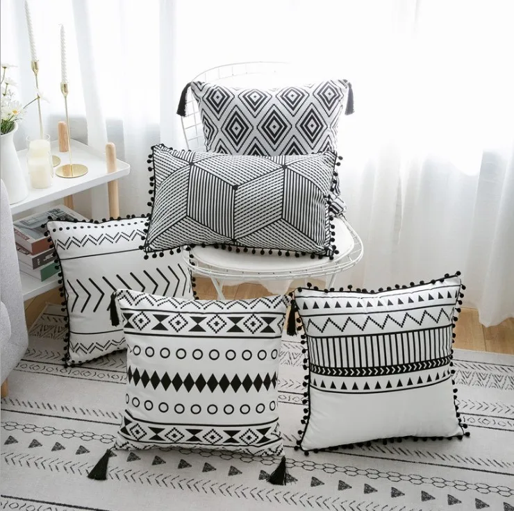 Черно-Белая бархатная наволочка, подушка с кисточками, Геометрическая декоративная подушка (не входит в комплект) 45х45см