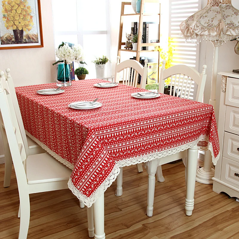 Льняная хлопковая Красная рождественская скатерть с деревом, белая кружевная кромка, моющаяся кофейная скатерть для свадебного банкета