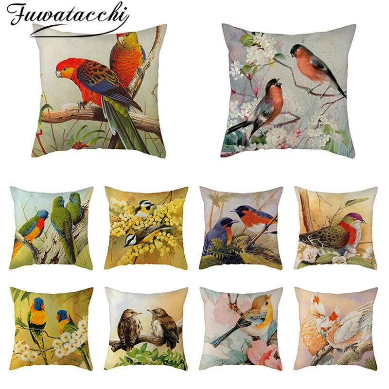 Чехол для подушки из чистого льна Fuwatacchi, милая подушка с птицей, чехол с изображением флоры и фауны для домашнего кресла, дивана, декоративные наволочки 45x45 см