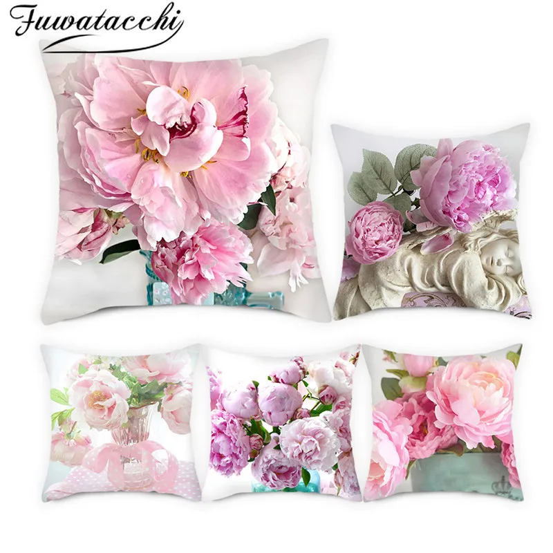 Fuwatacchi Plant Cushion Covers Pink Flowers Pillow Cases Cotton for Bedroom Sofa and Chair Decorative Pillow Covers 45*45