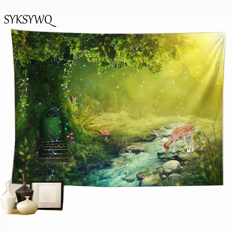 Зеленый гобелен с изображением деревьев природа река ковер с оленем настенный ткань гриб гобелены с оленями лес