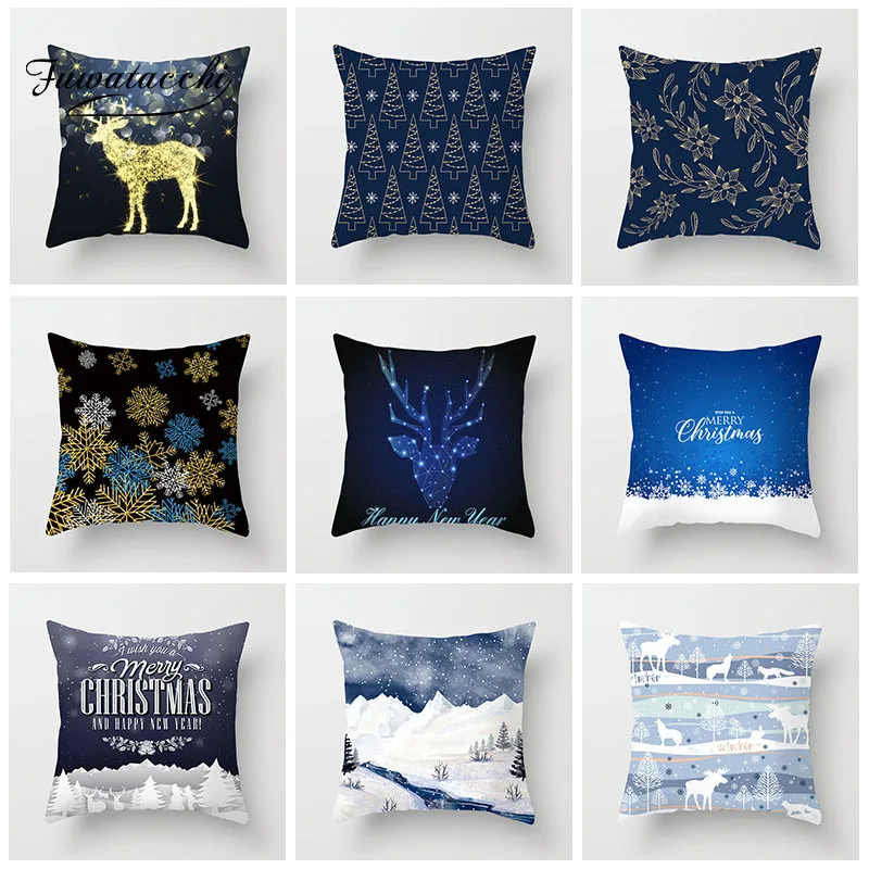 Рождественская Подушка Fuwatacchi, Снежная сцена, снеговик, подушка с принтом "Снежинка", Чехол для дома, дивана, автомобиля, декоративная синяя наволочка