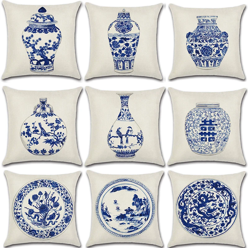 Винтаж китайский Стиль наволочка хлопок лен синий и белый подушка с изящным орнаментом Чехол для дивана Car Home Декоративные наволочки