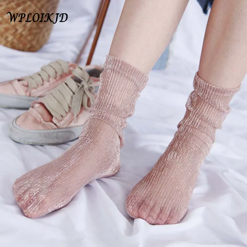 [WPLOIKJD] корейская мода носки для девочек новое поступление блестящие прозрачные носки цвета: золотистый, серебристый шелк для женщин книги п...