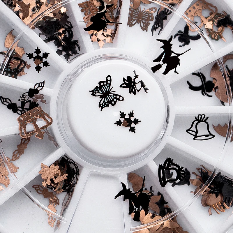Смешанные 12 форм черный золотой металл Хэллоуин Рождество дизайн ногтей украшения ломтик наклейки на ногти из фольги поддельные аксессуар...
