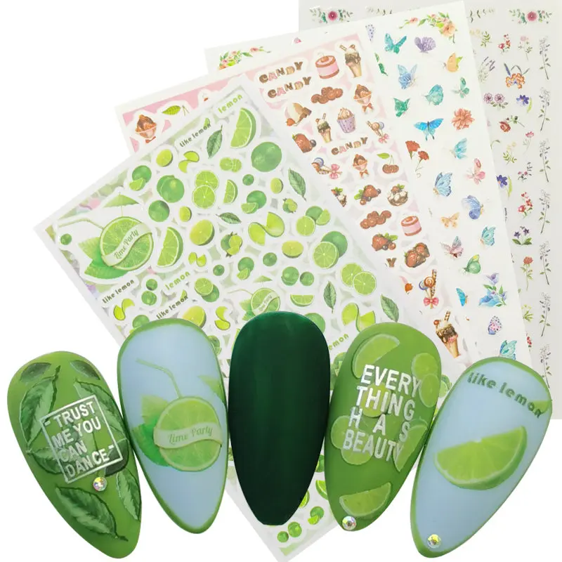 1 лист, 3D наклейки для ногтей, клейкие наклейки, цветы, листья, геометрия, фрукты, десерт, дизайны, слайдеры, тату, маникюрные украшения