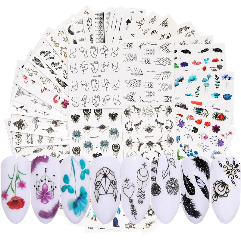 LEMOOC 45 шт./компл. черный с изображением цветов, переводные наклейки цветной дизайн ногтей наклейки бабочка кружева Ловец снов наклейти для ди...
