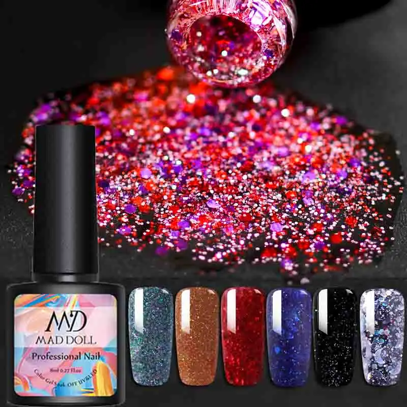 MAD DOLL 1 бутылочка 8 мл УФ-гель для ногтей чистый цвет и сверкающие блестки долговечный впитывающий Гель-лак для нейл-арта