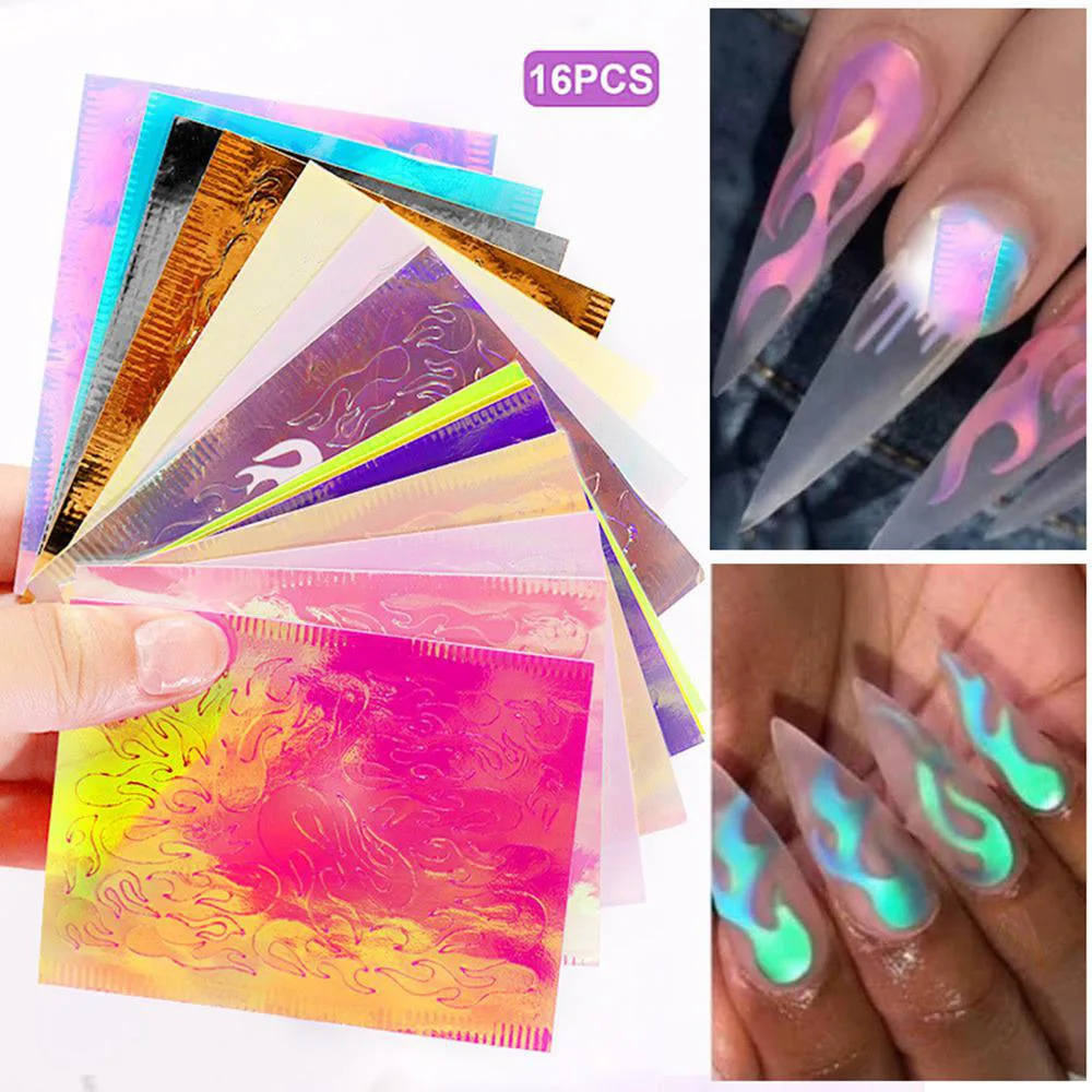 16 шт. DIY Лазерная Иллюзия пламени цветные наклейки на ногти пожарные отражения дизайн самоклеющиеся клей для ногтей стикер украшения