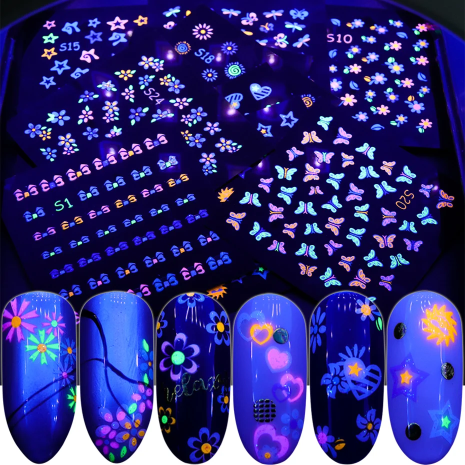 24 шт. флуоресцентные цвета наклейки для ногтей бабочка цветок Звезда Мультфильм Украшение Наклейка 3D передача клей для дизайна ногтей советы JIS1-24