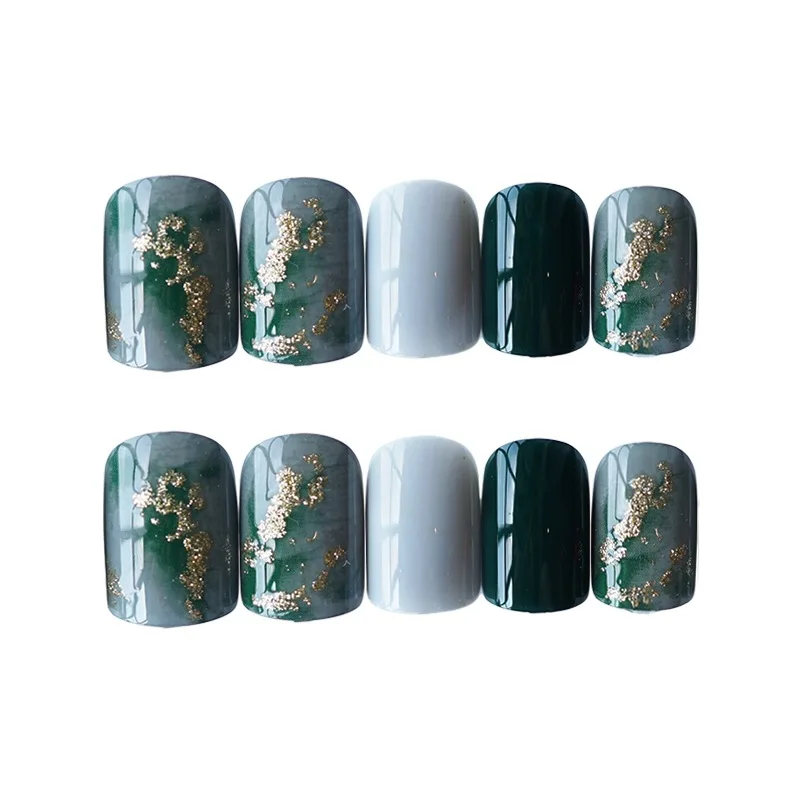 24 шт. зеленый цвет закончил накладные ногти площади с коротким полное покрытие накладные ногти Голдлиф Дизайн искусственных ногтей с клеем ...