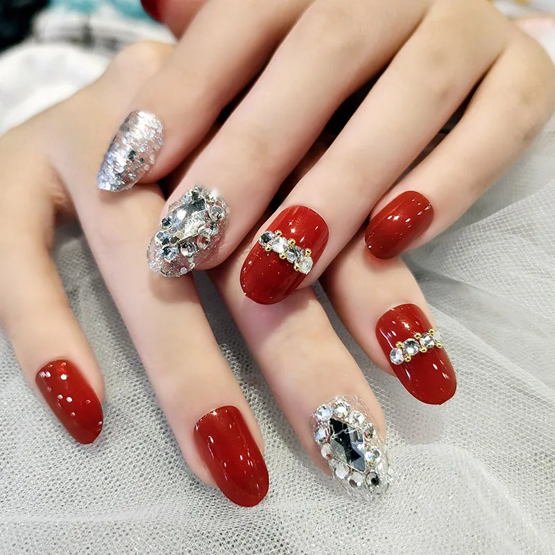 Красные накладные ногти с дизайном и клеем, полностью покрытые искусственным бриллиантом, свадебные накладные ногти для невесты, 24 шт./кор.
