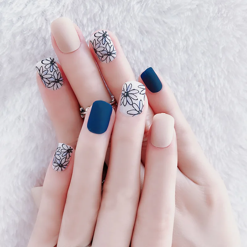 Короткий дизайн полный Готовые накладные ногти цветочный узор синий матовый пластик поддельные ногти Простые Модные накладные ногти с кле...
