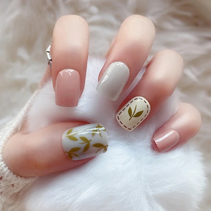 24 шт Свежие Листья литературы и искусства джентльменские короткие ногти для женщин носимые полное покрытие поддельные ногти с клеем нажмите на