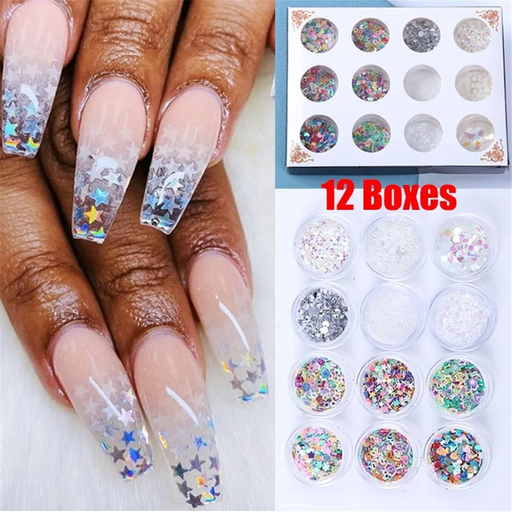Моня 12 Сетки 1/2/3 мм Nail Art разные цвета в произвольном порядке круглый ультратонких Блестки блестка 3D Шарм Мерцающая Снежинка Маникюр украшен...