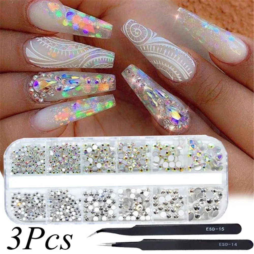 3D очаровательные драгоценные камни, Стразы для ногтей, мульти размер, плоская задняя часть, AB Кристалл, стразы, сделай сам, маникюрное стекло, украшения для ногтей с пинцетом, набор