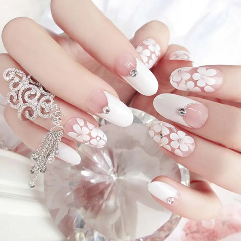 24 шт длинный мнимый гвозди с клеем свадебные ногти советы обнаженные искусственные конгле белые цветы дизайны для Ногтей Полное покрытие П...