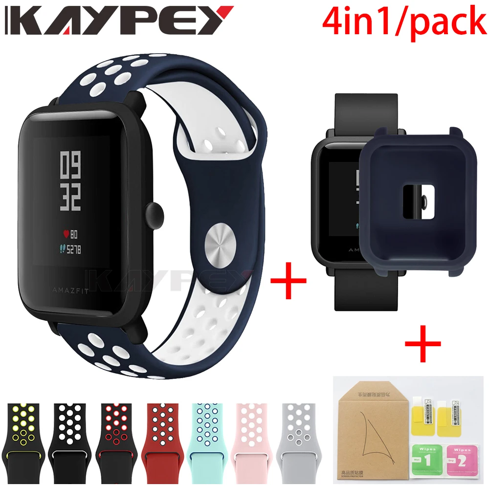 3in1 ремешок для умных часов для Xiaomi Huami Amazfit bip молодежи Смарт часы силиконовый браслет двойной цвет ремешок + мягкий чехол экран плёнки