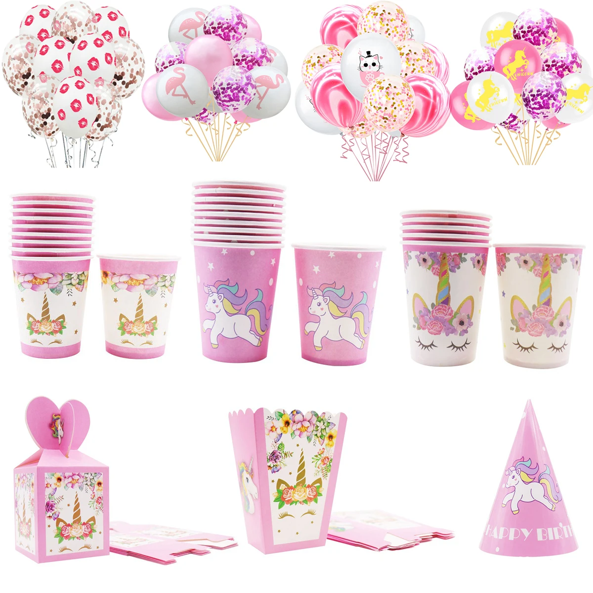 Милые розовые воздушные шары, Свеча «Единорог», одноразовая посуда, бумажный стаканчик, тарелка для мальчиков и девочек, для первого дня рождения, вечеринки, свадьбы, Декор