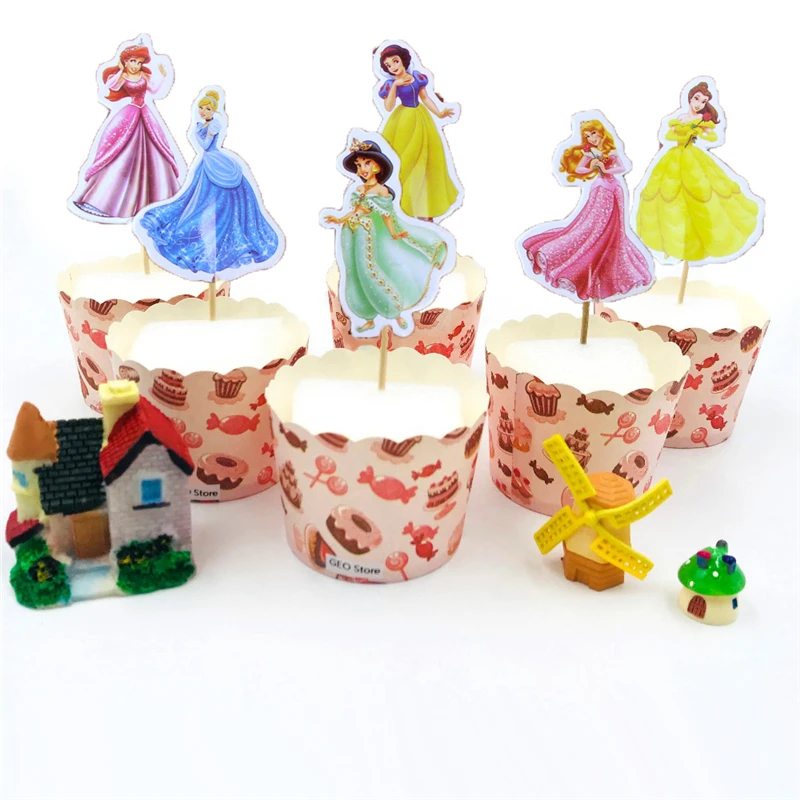 24 шт., Ариэль/Белоснежка/Белль/Золушка/Жасмин/Аврора, принцесса, кекс, обертки, товары для дня рождения, украшения