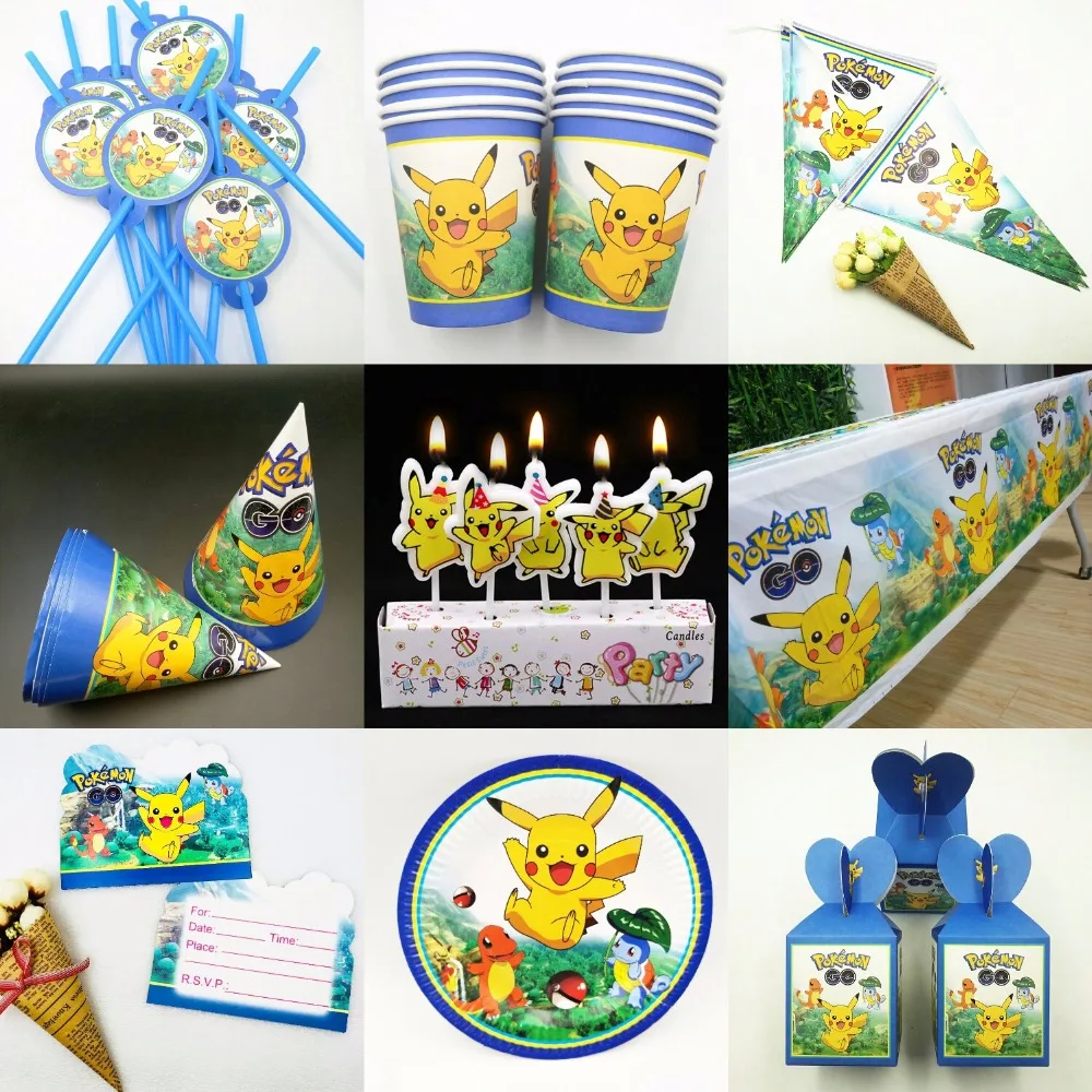 Pikachu Pokemon украшения на день рождения, товары для вечеринки, Детская душевая посуда, скатерть, тарелки, чашки, баннер, сувениры, подарочные наборы