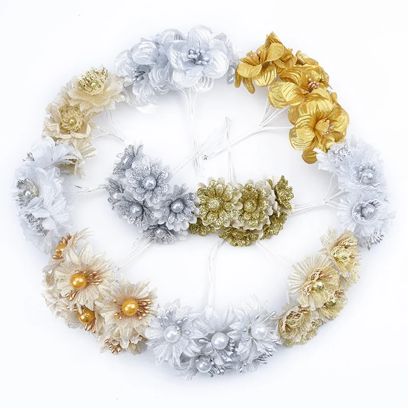 6 шт. Искусственные цветы Золото Серебро Рождество Новый год декоративные свадебные цветы украшение дома аксессуары венок поддельные растения