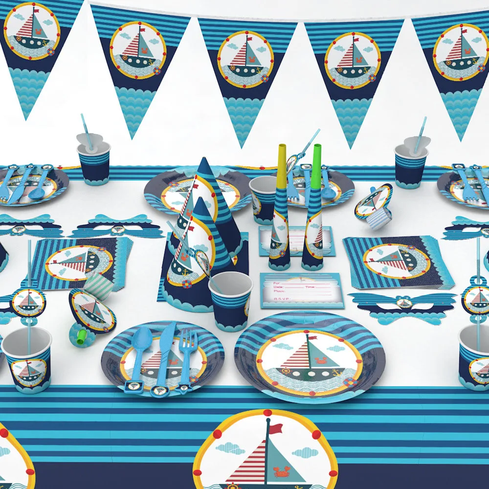 Морская тематика наборы посуды для детей день рождения украшения морской синий Лодка бумажные тарелки и стаканы парусник вечерние принадлежности