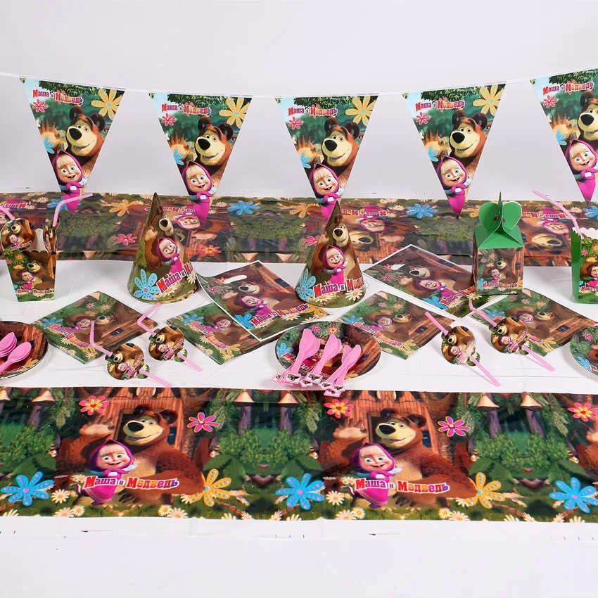 Бумажный стаканчик с героями мультфильма «Маша и Медведь», соломенная тарелка с флагом для детей, товары для украшения дня рождения, одноразовая посуда