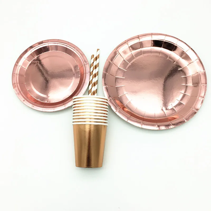 Золотистый Серебристый с розой золото одноразовые посуда набор бумага чашки пластины соломинки топперы на свадебный торт украшения День С...