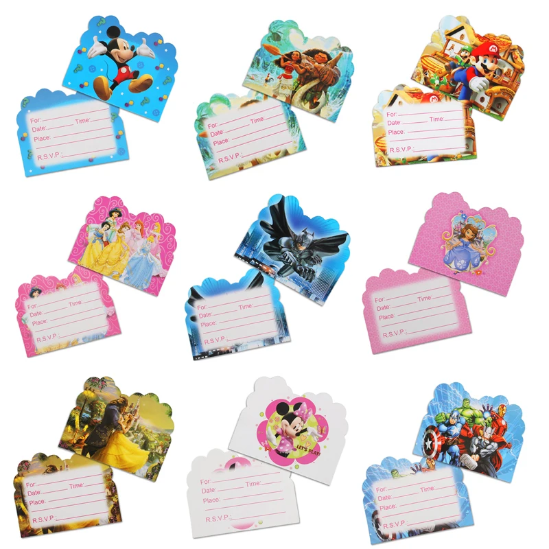 10 шт. мультфильм тема пригласительная открытка конверт Микки/единорог/Принцесса/Человек-Паук День рождения карты Дети День рождения вечери...