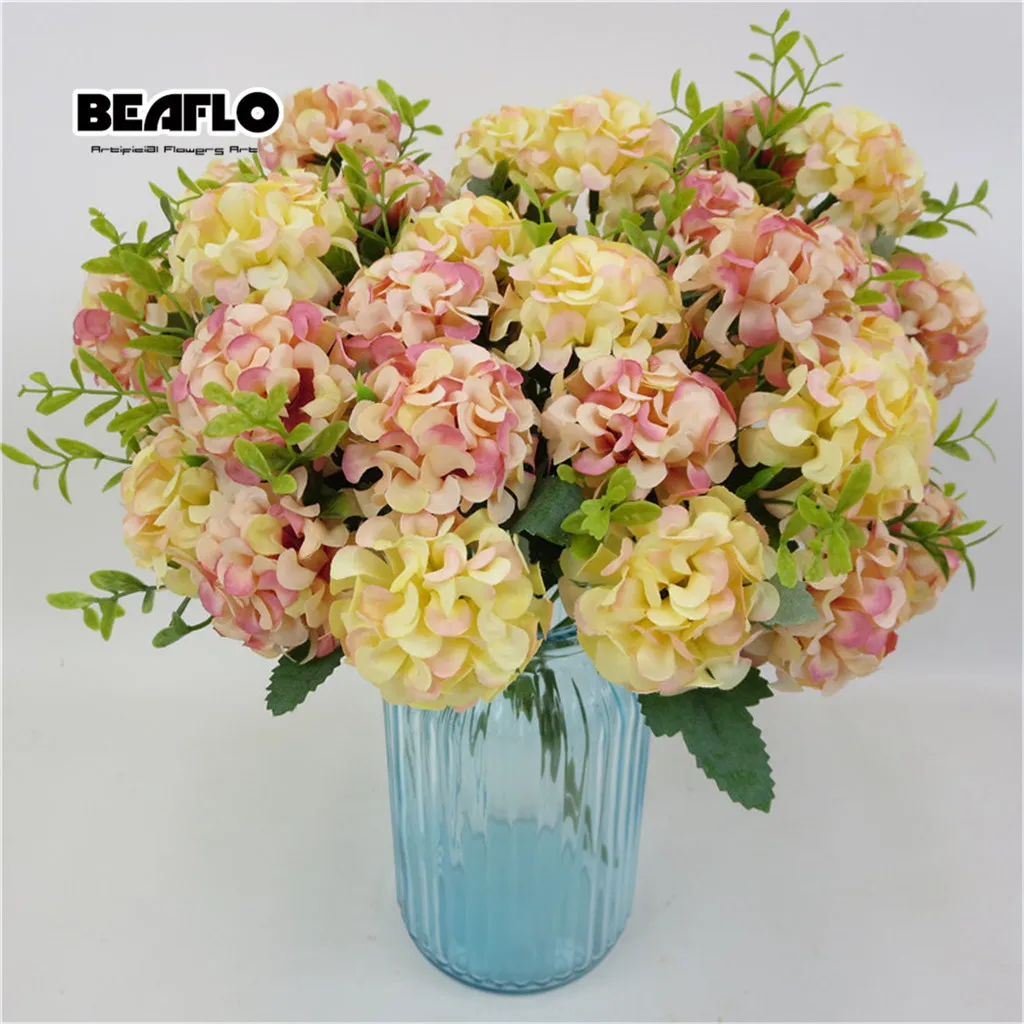 1 букет Искусственные цветы гортензии шелк искусственный шар цветок с листьями Флорес для DIY домашнего сада Свадебные украшения