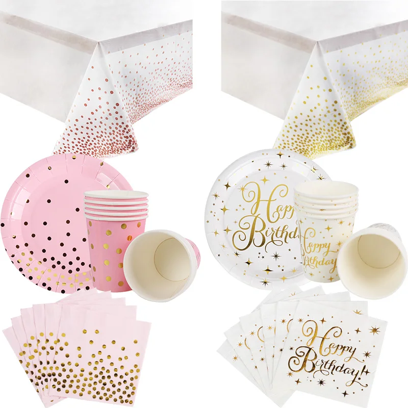 Одноразовый набор посуды в розовый горошек/с золотым узором в виде звезд, посуда для вечеринки в честь Дня Рождения, детский набор для душа, свадьбы, вечеринки, свадебного душа