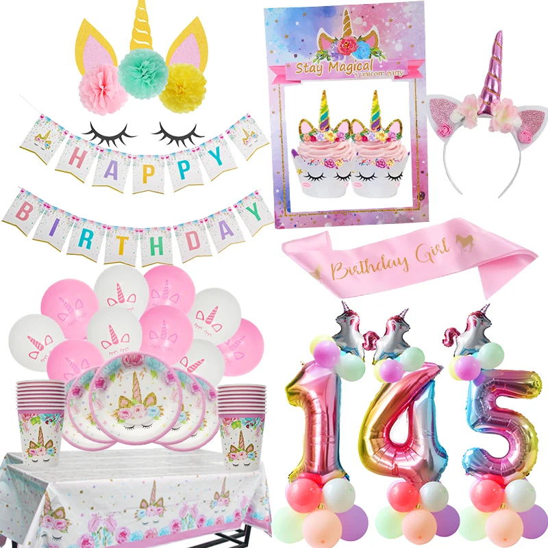 Единорог, вечерние, бумажные тарелки, чашки, розовые латексные шары, фоторамка, реквизит, Детские декорации на день рождения, декорации на св...