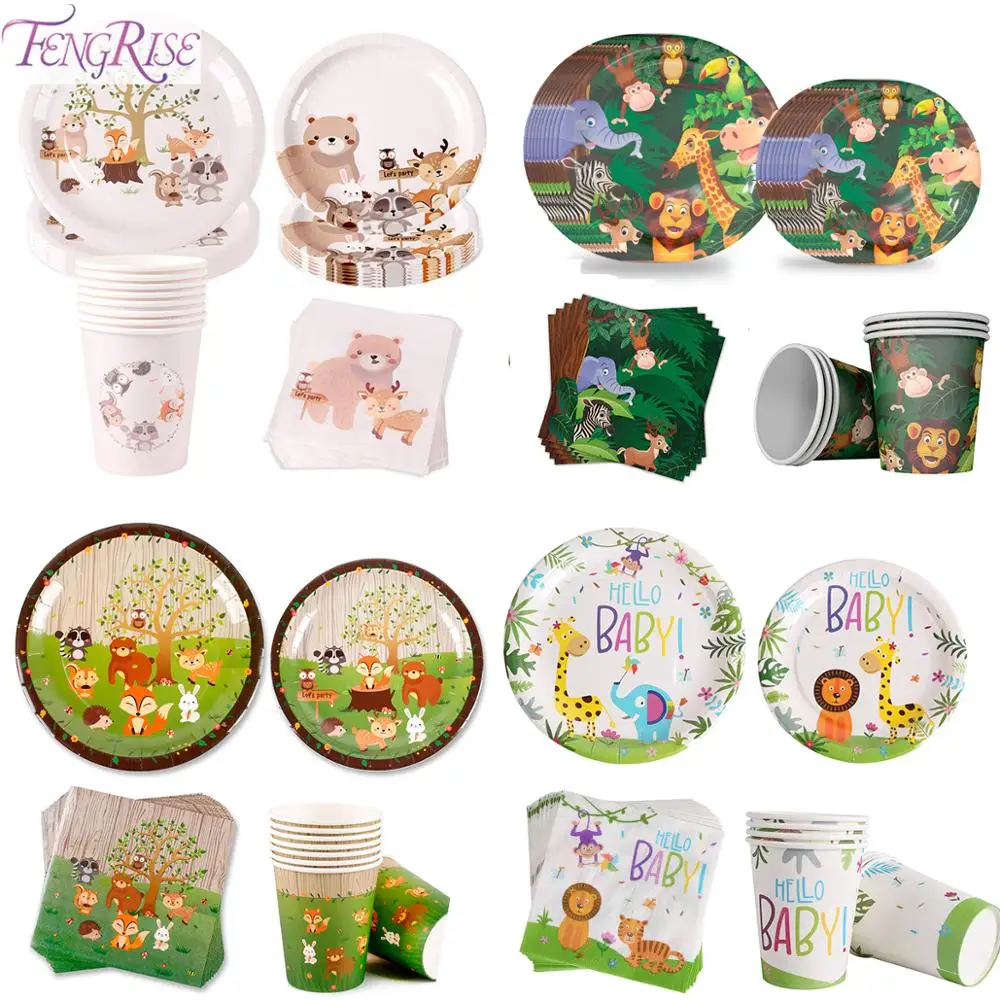 FENGRISE Лесной животных Одноразовые столовые приборы набор сафари джунгли вечерние принадлежности бумажные тарелки и стаканы день рождения ...