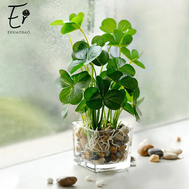 Erxiaobao искусственные растения со стеклянным горшком имитация бонсай в горшке помещается зеленый четырехлистный клевер украшение для домашнего стола окна