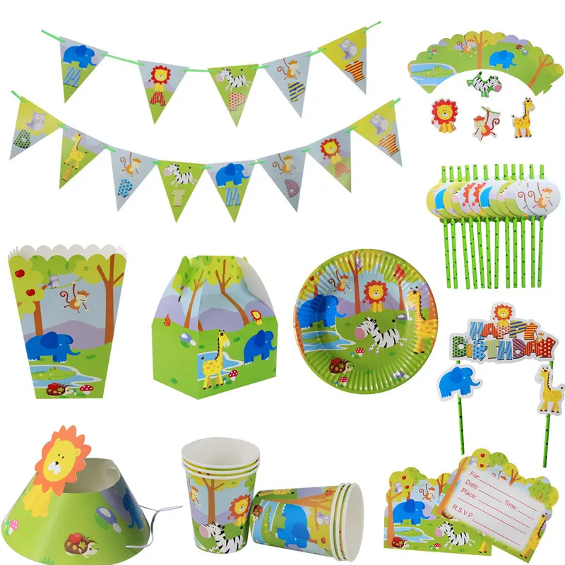 Динозавр в джунглях тема животных набор посуды флаг бумажные тарелки стаканчики вечерние украшения салфетки Шапки соломинки Safari зоопарк в...